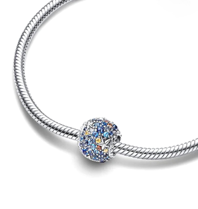 Naplňte svůj styl kosmickou krásou sluneční soustavy s třpytivým přívěskem Planeta Merkur a Hvězdy. Lidé byli od pradávna fascinováni noční oblohou – naše série inspirovaná sluneční soustavou čerpá inspiraci z krásy planet a jejich moderního ztvárnění v popkultuře. Tento ručně dokončený sférický přívěsek z mincovního stříbra je po celém povrchu zdoben pavé s kombinací broušených kamenů a hladkých kamenů se zaoblenými vrcholy, které vytvářejí třpytivý, vodní efekt. Kombinace modrých, medových a hnědých odstínů zachycuje vzhled planety a malé vystouplé stříbrné Hvězdy dotvářejí Kosmický efekt. Řada vystouplých hvězd a mikrokuliček tvoří okraj kolem každé strany otvoru přívěsku. Noste jej na svém oblíbeném držáku přívěsků a dodejte svému stylu nebeský nádech.