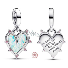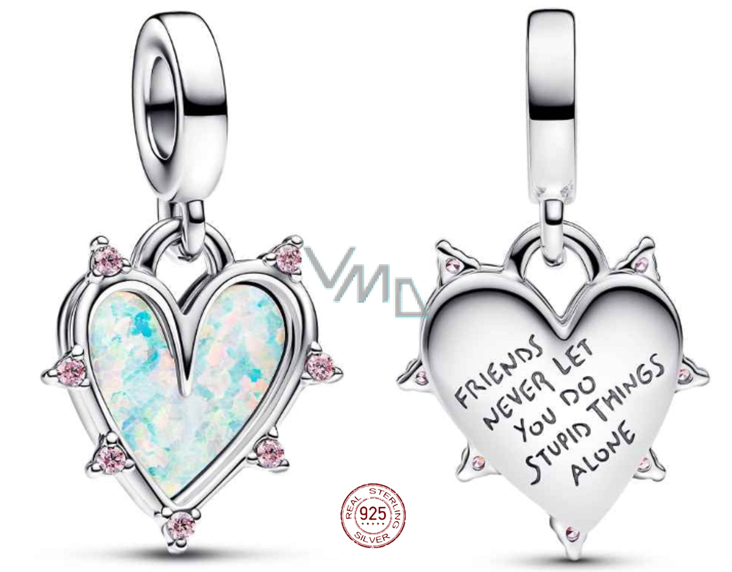 Visací přívěsek vyrobený z 925 sterlingového, mincovního, stříbra nám připomíná, že přátelé nás dotvářejí. Obsahuje dva přívěsky, z nichž jeden je vyplněn opaleskujícím laboratorně vytvořeným Opálem a na spodní straně má vyryto: "Friends never let you do stupid things alone" - Přátelé tě nikdy nenechají dělat hlouposti samotného. druhý obsahuje vyřezávané srdce se sedmi třpytivými růžovými Zirkony. Darujte to svému nejlepšímu příteli a projevte mu tak svou lásku a uznání.