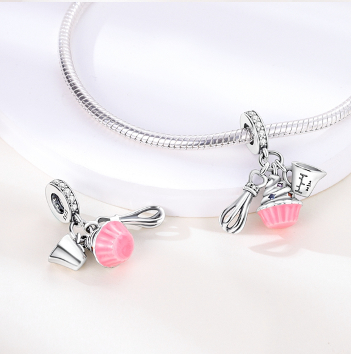 Visací přívěsek 925 Sterling Silver s metličkou, odměrkou a lahodným košíčkem s posypem. Dekorováno hladkým růžovým smaltem a barevnými třpytivými drahokamy Zirkonu. Prsten přívěsku zdobí bílý zirkon po celém obvodu. Vyprávějte svůj příběh s každým přívěsek a vytvořte náramek, který odráží, kdo jste a co je pro vás důležité. Tvůj styl. Váš náramek. Tvůj příběh.