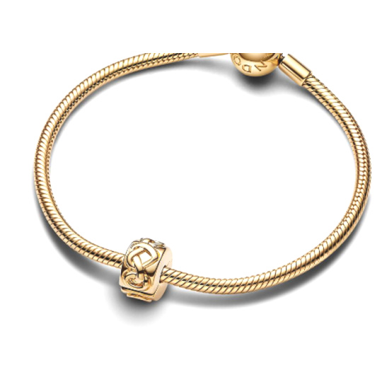 Jednoduché, ale nápadné klipové kouzlo z pozlaceného sterlingového stříbra 925 je zdobeno řadou vázaných srdíček. Design se vyznačuje kombinací ikonického srdce a klasického milostného uzlu, který dodává kousku extra emocionální přitažlivost. Přívěsek je jemně pozlacený 14karátovým zlatem je ideální pro přidání srdečného doteku vaší sbírce náramků. Toto přívěšek nemá silikonovou rukojeť, takže bude klouzat, pokud nebude nasazeno na nitě (dvě vyvýšené přepážky přívěšku).
