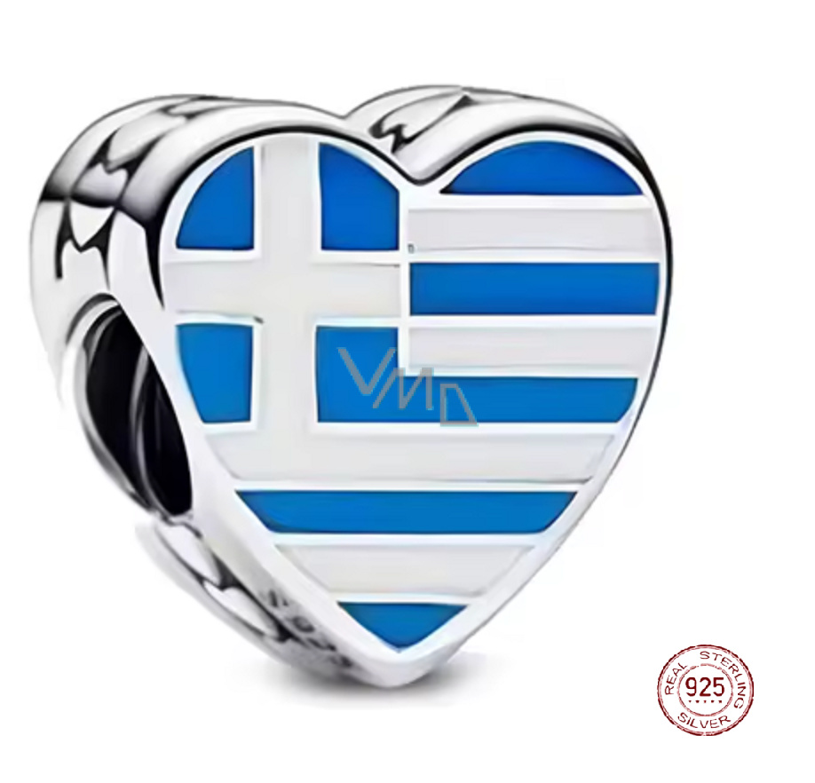 Charm Sterlingové stříbro 925 Řecko – srdce s vlajkou, korálek na náramek cestování