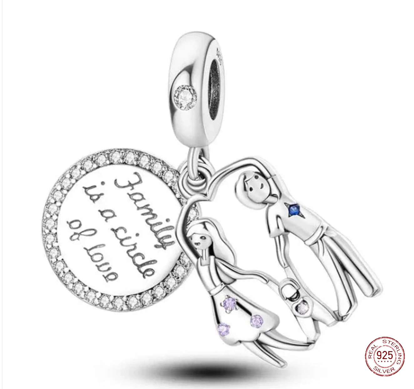 Vysoce kvalitní sterlingové stříbro s ryzostí 925 pro nadčasový vzhled. Šperk slouží jako dokonalá připomínka silného pouta lásky ve vaší rodině. Obsahuje dva přívěsky, jeden znázorňuje muže a ženu držící se za ruce a ozdobeny Zirkony. Spodní kruh má kruhový tvar a rytí - "Family is a circle of love - Rodina je kruh lásky." Vyprávějte svůj příběh s každým kouzlem a vytvořte náramek, který odráží, kdo jste a co je pro vás důležité. Váš styl. Váš náramek. Tvůj příběh.