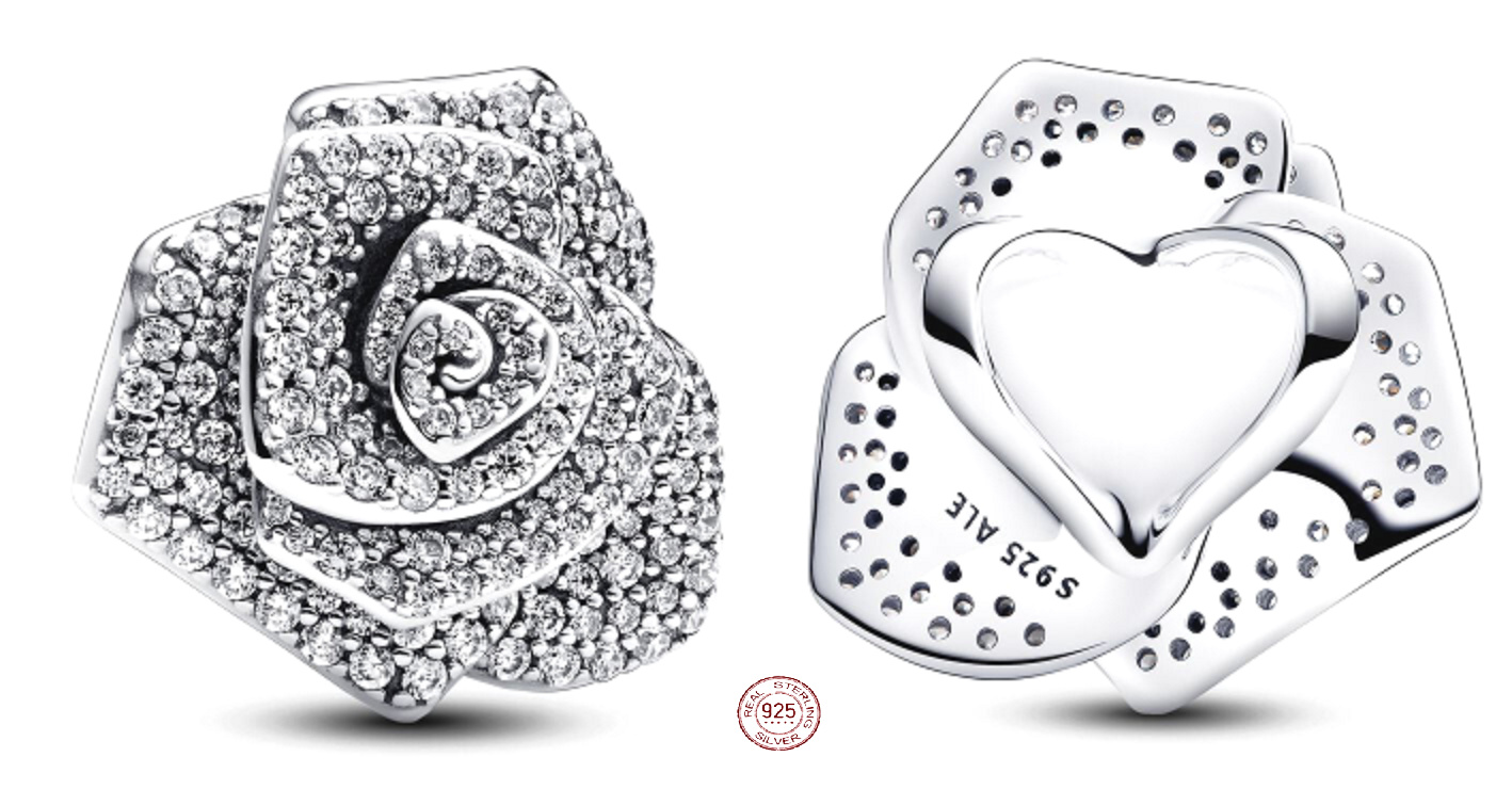 Dodejte lesk s nadměrným přívěskem. Tento poutavý kousek se vyznačuje složitým motivem nadměrné velikosti růží s asymetrickými vrstvami, zdobený 38 mikro a 149 korálky vsazenými čirými kubickými Zirkony pro oslnivý efekt. Stříbrný přívěsek má funkční otvory pod každým okvětním lístkem a také dva otvory ve tvaru stonku na zadní straně, které umožňují jemný průchod řetízku. Větší než ostatní přívěsky s průměrem 20 mm, plynule vylepšuje jak náramky, tak náhrdelníky. Přijměte nadčasový symbol lásky s tímto nádherným kouzlem růže.