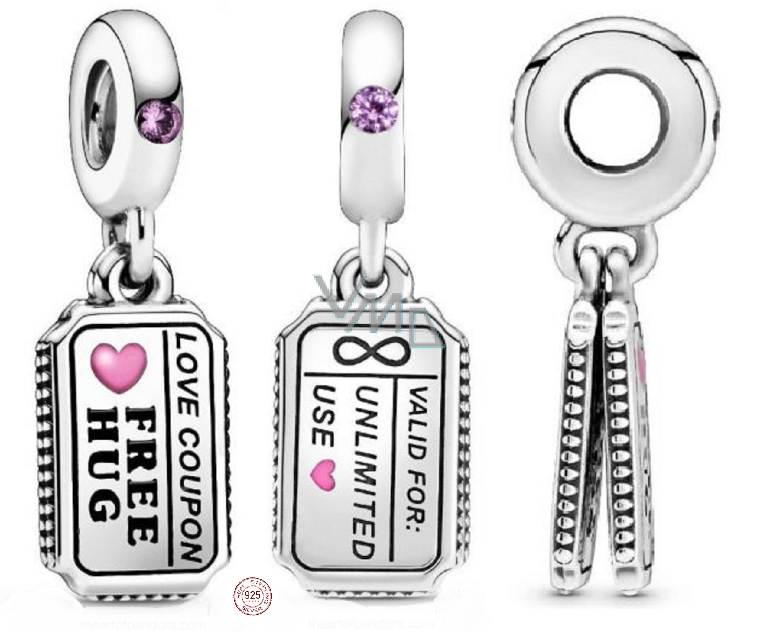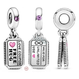 Zábavné přívěskové kouzlo Love Coupon obsahuje sadu kuponů s vyrytými slovy: „Love Coupon Free Hug“ - Objetí zdarma s kupónem lásky, „Love Coupon Free Kiss“ - Kupon na polibek z lásky zdarma a "Valid for: Unlimited use" - Platí pro neomezené použití. Malinovo růžová smaltovaná ikona srdce a rtů dodávají roztomilý detail a do balíku jsou zasazeny dva třpytivé syntetické safíry.