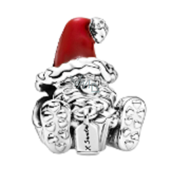Vánoční přívěsek ze stříbra 925, zdoben smaltem. Korálek Santa je ve velké santovské čepici sedící na podlaze s vánočním dárkem mezi nohama. Velká červená čepice zakrývající oči, dárek s obří mašlí převázanou pozdravem, štítek má nápis, Santa má nápadný velký nos, na podrážce boty je vzor srdce. korálek je inspirovaný vysněným vánočním časem. Nápis: "X Santa"