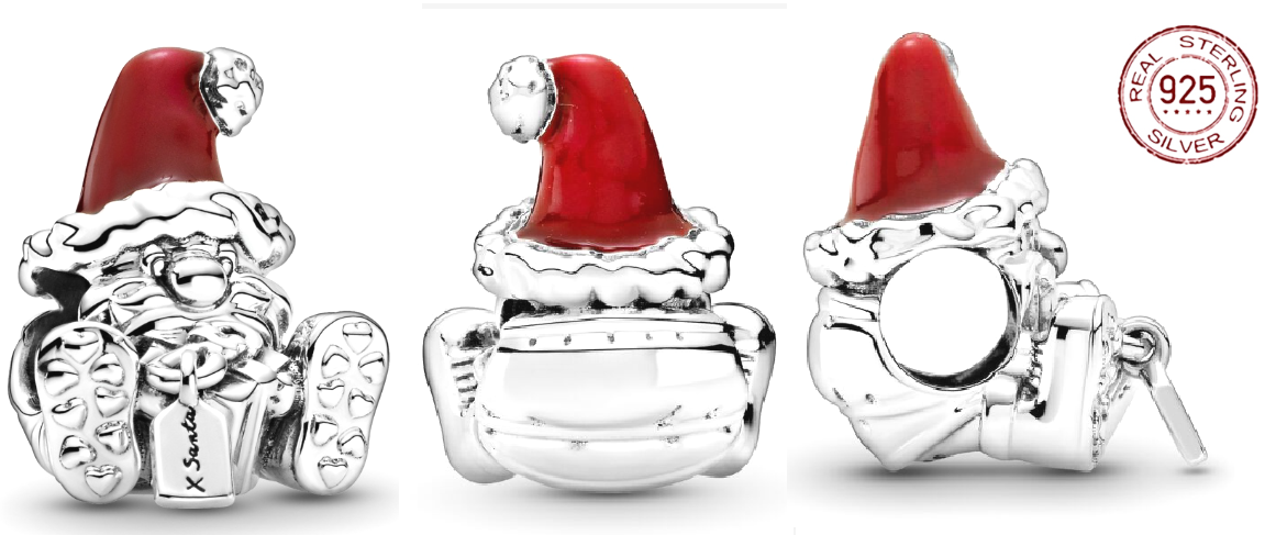 Vánoční přívěsek ze stříbra 925, zdoben smaltem. Korálek Santa je ve velké santovské čepici sedící na podlaze s vánočním dárkem mezi nohama. Velká červená čepice zakrývající oči, dárek s obří mašlí převázanou pozdravem, štítek má nápis, Santa má nápadný velký nos, na podrážce boty je vzor srdce. korálek je inspirovaný vysněným vánočním časem. Nápis: "X Santa"