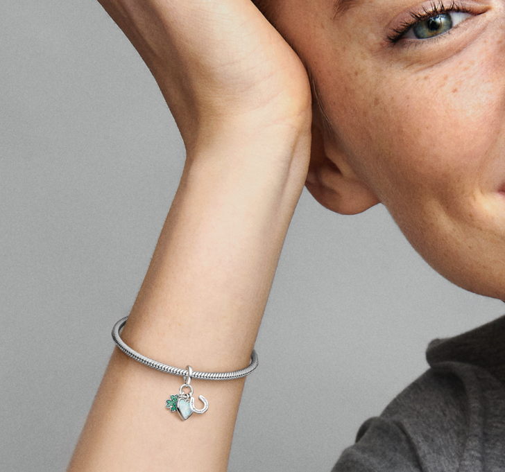Charm Sterlingové stříbro 925 Sestra čtyřlístek pro štěstí, srdce a podkova 3v1, přívěsek na náramek rodina