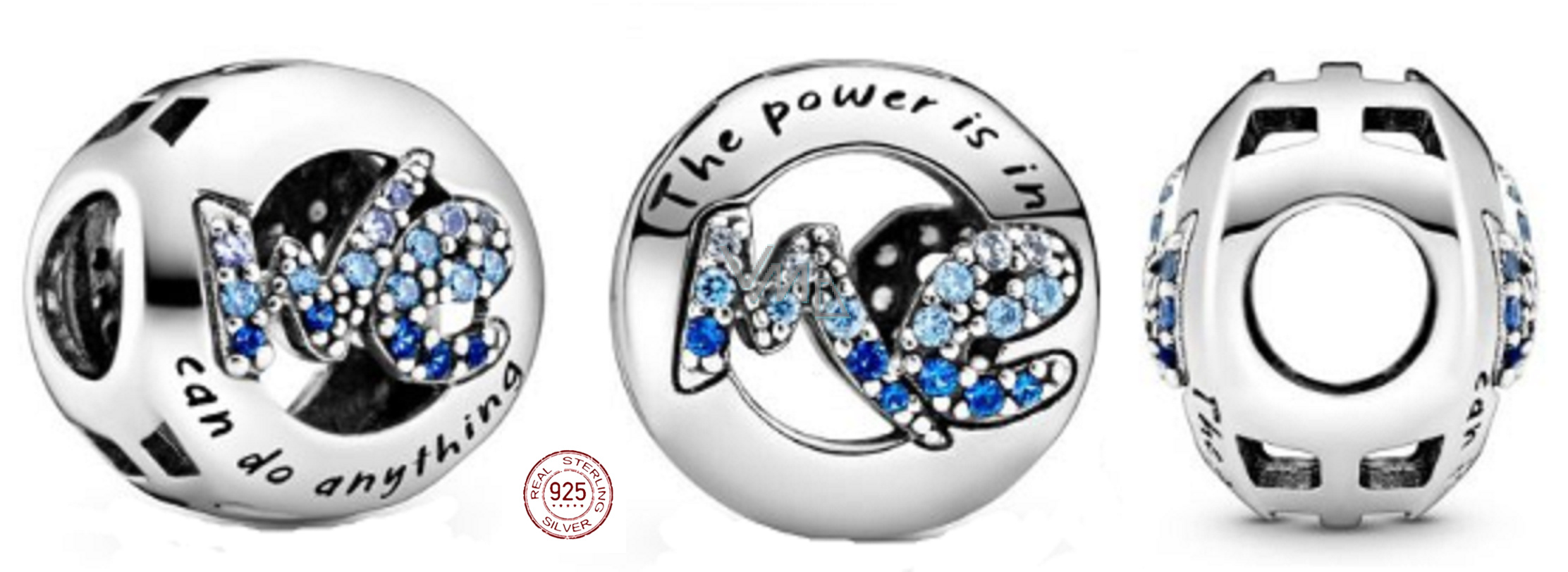 Korálek ze sterlingového stříbra 925 obsahuje třpytivé modré kameny s názvy „we (my) a me (vy)“ . Na každé straně tohoto hladkého Stříbrného prolamovaného kouzla je vyryta kompletní zpráva a v překladu zní: „můžeme udělat cokoliv“ na jedné straně a „síla je ve mně“ na straně druhé.