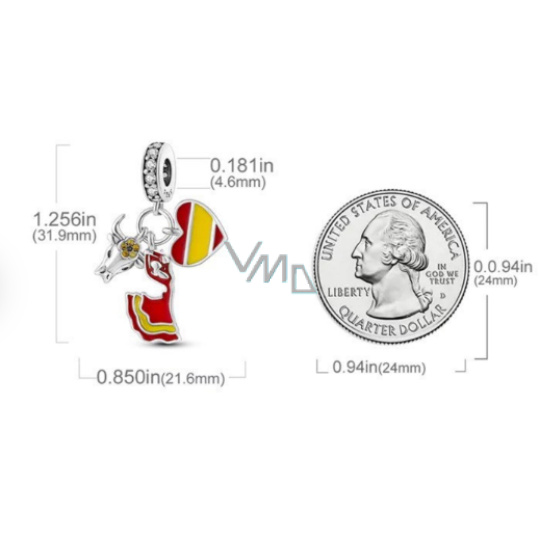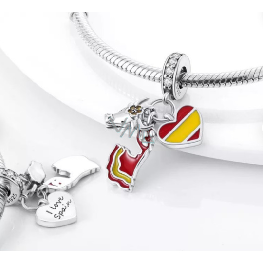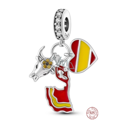 Charm Sterlingové stříbro 925 Španělsko vlajka srdve - Býčí zápas, flamenco, miluji Španělsko 3v1 přívěsek na náramek cestování