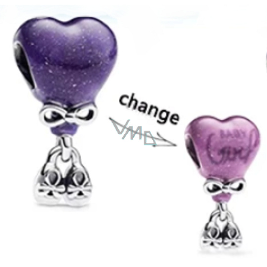 Stříbrný korálek balón s dětskými botičkami, korálek je pokryt glazurou, která při vyšší teplotě (cca od 36 ºC – 40 ºC) změní barvu z fialové na růžovou a odkryje nápis „Baby Girl“ (holčička).