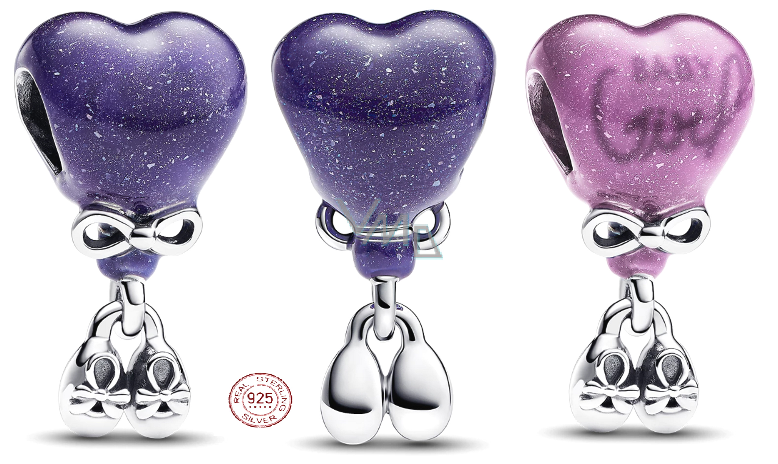 Oživte svůj vzhled fialovým kovovým korálkem ve tvaru srdce. Je ručně vyrobený ze stříbra 925 Sterling Silver a zdoben ručně nanášeným transparentním fialovým smaltem. Doplněn je mašličkou a botičkami a potěší každou maminku. Nejlépe vynikne na vašem náramku v kombinaci s minimalistickými přívěsky, případně jej noste s jinými barevnými šperky pro živý a dramatický vzhled.