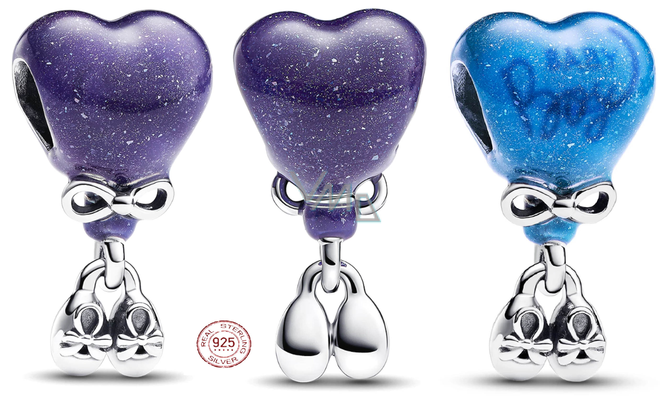 Stříbrný korálek balón s dětskými botičkami, korálek je pokryt glazurou, která při vyšší teplotě (cca od 36 ºC – 40 ºC) změní barvu z fialové na modrou a odkryje nápis „Baby boy“ (Chlapeček).