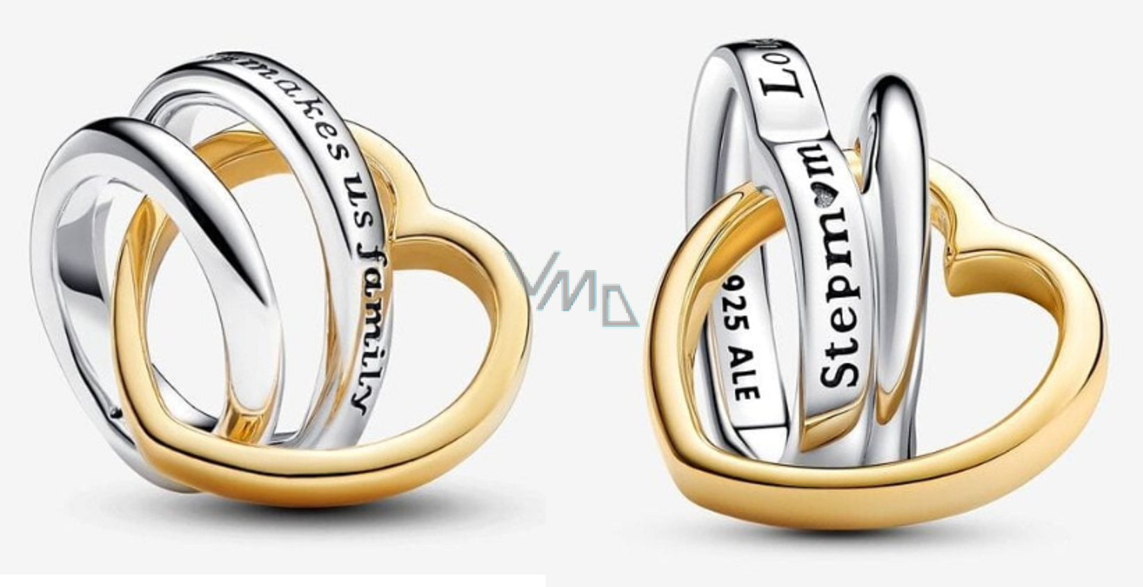 Udržujte své lásky blízko s dvoubarevným kouzlem, vyrobeným ze sterlingového stříbra a se srdcem jemně pozlaceným 14karátovým zlatem. Motiv propletených srdcí symbolizuje vaše nejcennější rodinná pouta. Mezi okouzlující prvky patří jemně vytvořené linie tvořící tvar srdce s vyrytým vzkazem: "Stepmum (macecha) a Love makes us family (Láska z nás dělá rodinu)." Jedinečný design zahrnuje vytištěné srdce pro „u“ a kruh ze sterlingového stříbra připevněný pod úhlem. Tento kousek, inspirovaný různými postavami matek, je upřímným vyjádřením rodinné lásky.