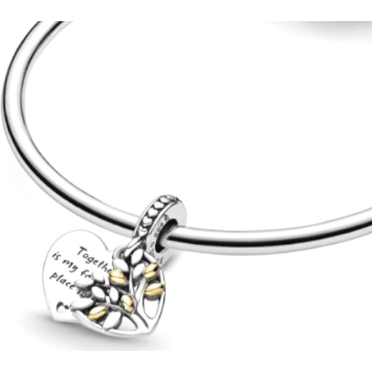 Vzdejte hold svým nejsmysluplnějším vztahům s tímto dvoubarevným přívěskem Family Tree ve tvaru srdce. Prolamovaný šperk, ručně zpracovaný, má motiv stromu na leštěném kotouči ve tvaru srdce zdobeném rytinou. Přívěsek také obsahuje lístky a řadu srdíček vyražených na háčku. Kouzlo doplněné rytinou „Společně je moje oblíbené místo“ a razítkem na háčku je perfektním dárkem pro zvláštní osobu na oslavu pouta, které vás spojuje.
