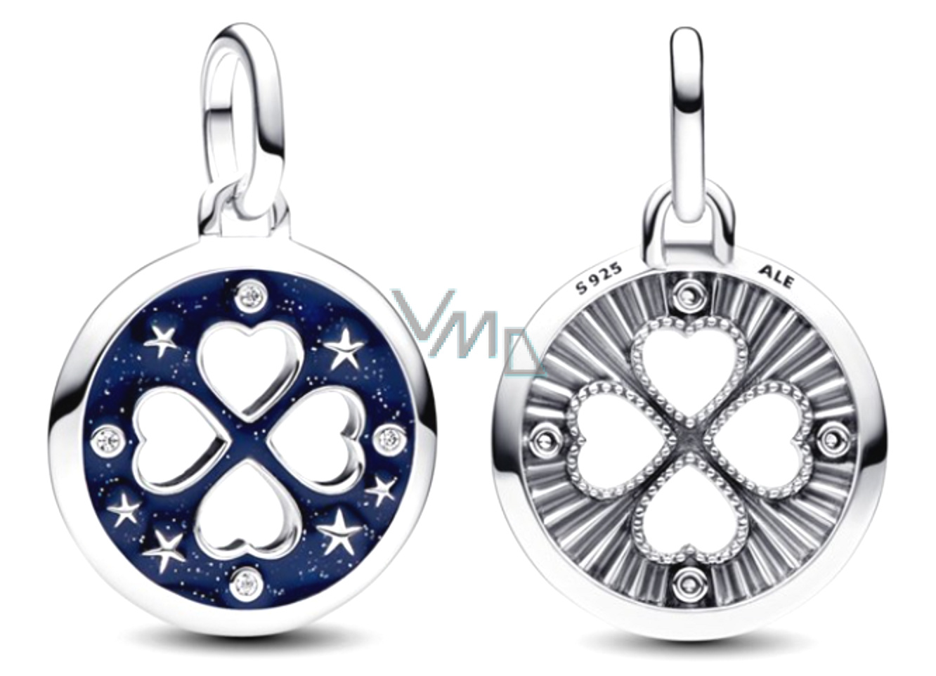 Tento moderní amulet vyzařuje lásku a štěstí se čtyřmi výřezy ve tvaru čtyřlístku obklopeného třpytivým tmavě modrým smaltem, čirými kameny a vyvýšenými hvězdami. Zadní stranu zdobí rýhované linie a mikro kuličky.