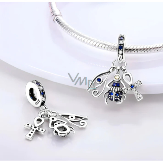 Trojitý přívěsek 925 Sterling Silver se starověkými egyptskými symboly, které se nosí pro ochranu a štěstí. Navrženo s modrými a bílými drahokamy Zirkonu. ANKH, známý jako klíč života, je symbolem věčného života. Horovo oko je symbolem zdraví a ochrany a skarabeus symbolizuje vycházející slunce a vzkříšení.