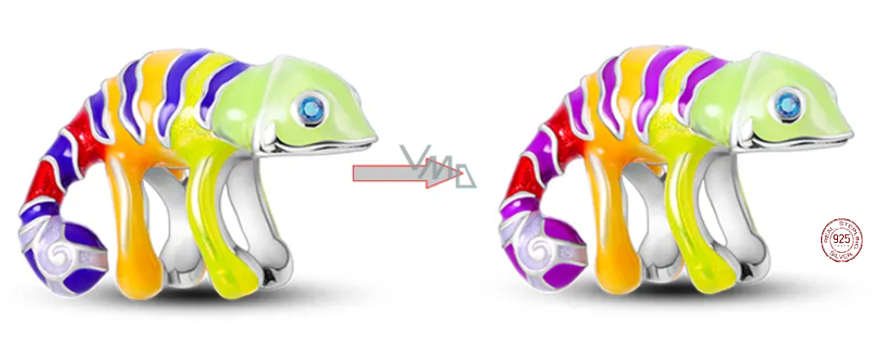 Jeho termochromatický smalt je tím, co ho dělá jedinečným. Roztomilým Chameleonem měnící se barvy, navržený s hladkým barevným smaltem. Pruhy malého Chameleona ve skutečnosti mění barvu od světle fialové po tmavě fialovou v závislosti na teplotě. Chcete-li změnit teplotu, stačí kouzlo zakrýt rukou a teplo vašeho vlastního těla by mělo změnit barvu chameleonových pruhů.