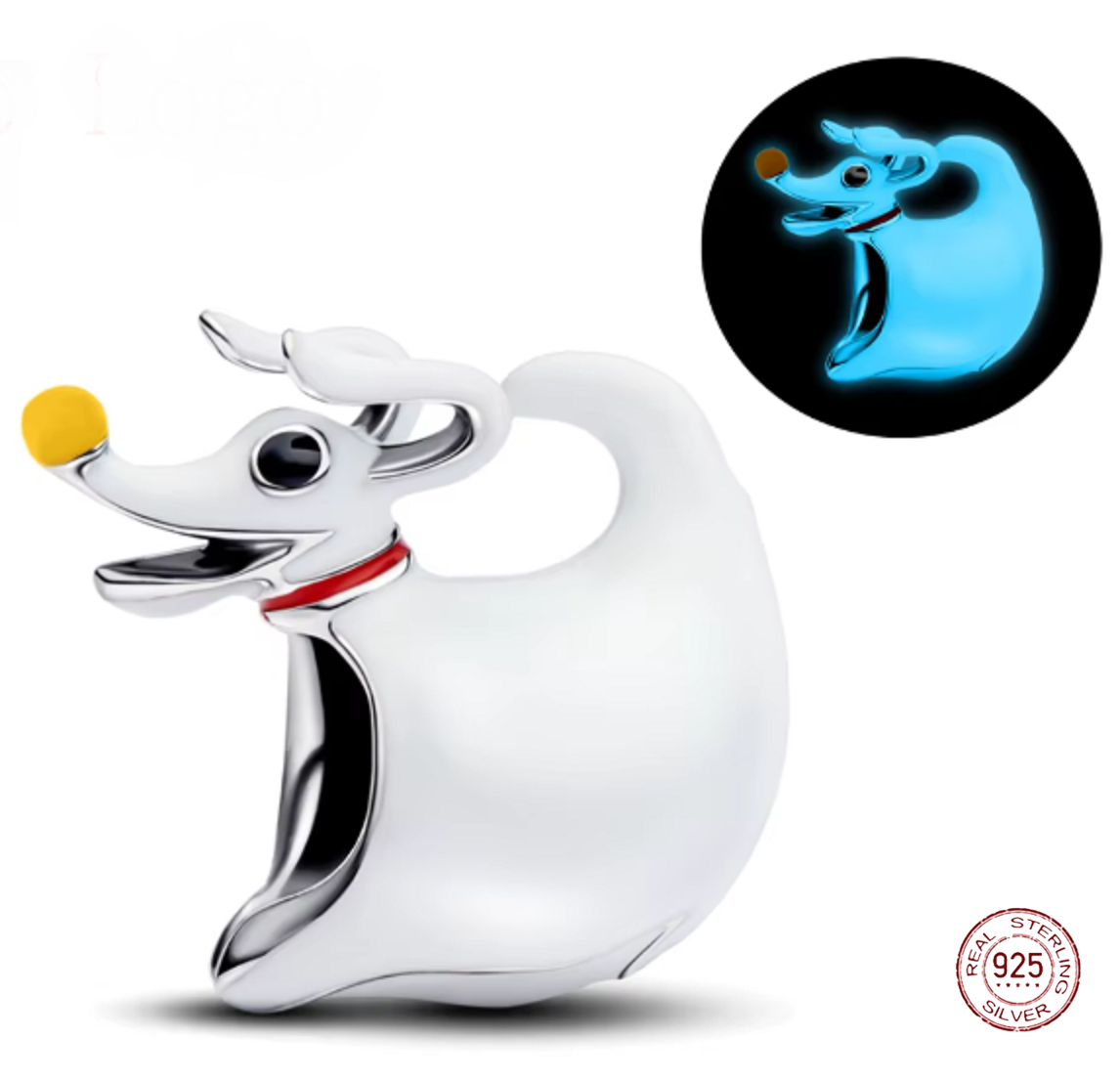 Charm Sterlingové stříbro 925 Tim Burton, Noční můra před Vánoci Zero – kouzelný pejsek s dýňovým čumáčkem svítí ve tmě, korálek na náramek film