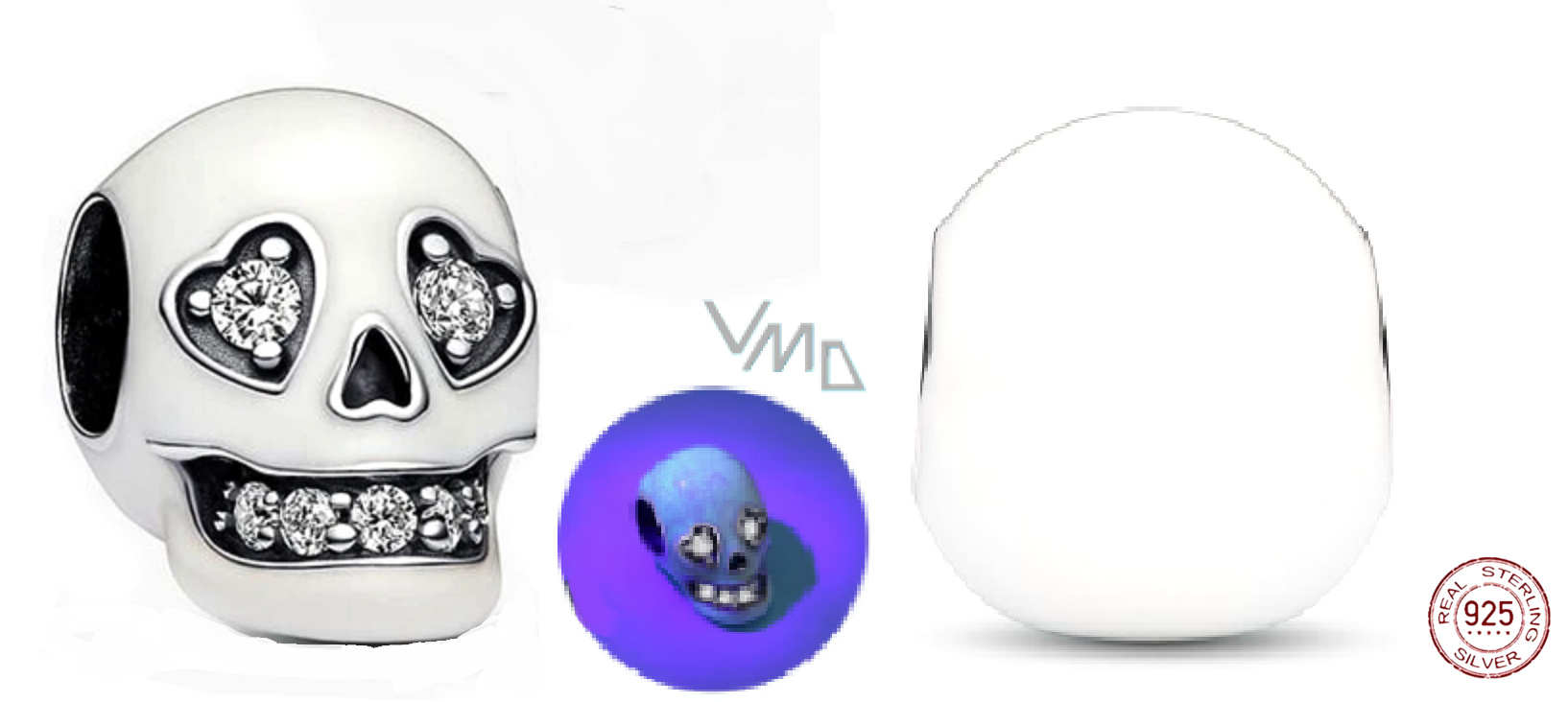 Korálek ze sterlingového stříbra 925 ve tvaru lebky je doplněn kamínky zirkonů a hodí se pro všechny milovníky koster a Halloweenu. Navíc má luminozní vlastnost, ve tmě se rozsvítí do modra, tak rozzáří i váš náramek.