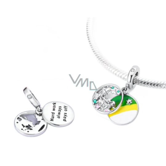 Visací přívěsek ze sterlingového stříbra 925 se dvěma přívěsky. Jeden je navržen s prolamovaným designem se spícím Králíkem a Želvou, navržený se zelenými a růžovými třpytivými Zirkony. druhý přívěsek působí jako pozadí a je navržen s odstíny hladké zelené, žluté a bílé smaltované barvy. Na zadní straně přívěsku je vyrytý nápis „Hard work always pays off - Tvrdá práce se vždy vyplatí“. Vyprávějte svůj příběh s každým kouzlem a vytvořte náramek, který odráží, kdo jste a co je pro vás důležité. Váš styl. Váš náramek. Tvůj příběh.