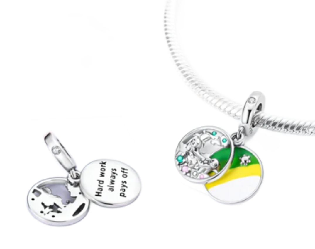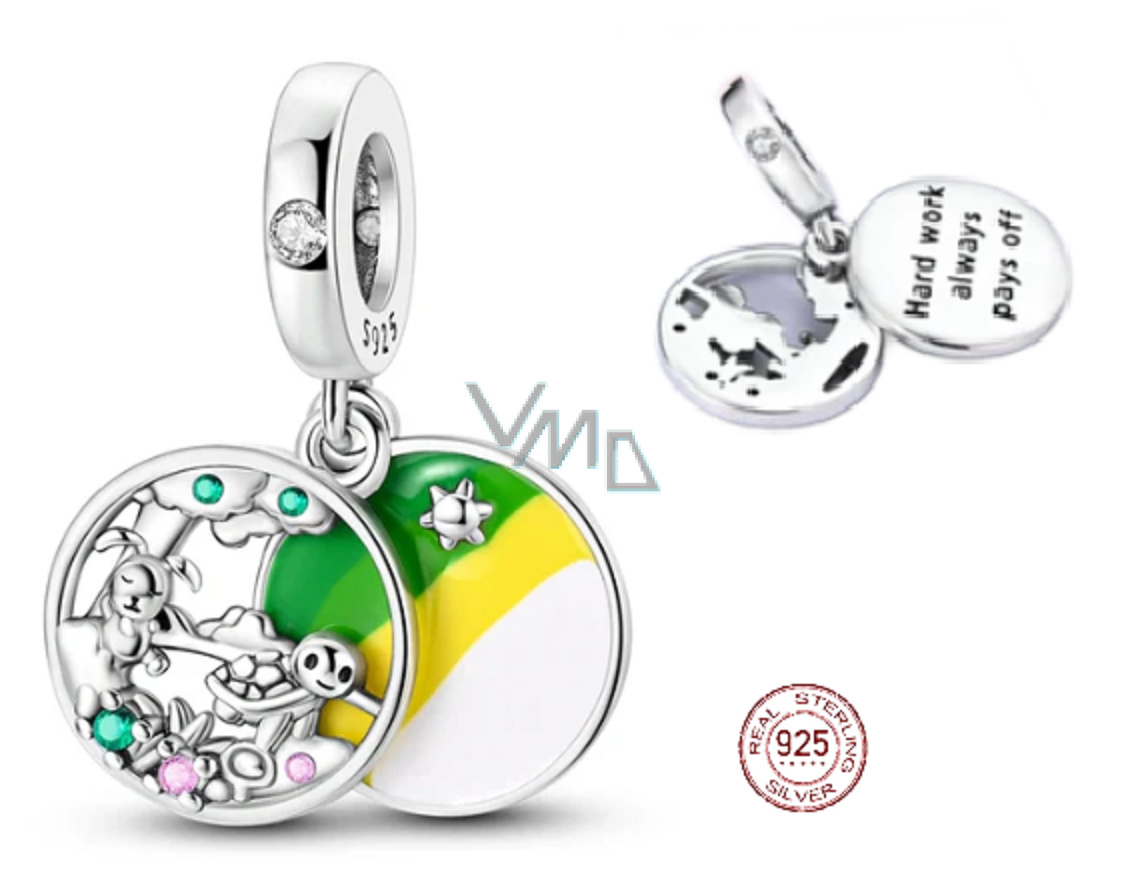 Visací přívěsek ze sterlingového stříbra 925 se dvěma přívěsky. Jeden je navržen s prolamovaným designem se spícím Králíkem a Želvou, navržený se zelenými a růžovými třpytivými Zirkony. druhý přívěsek působí jako pozadí a je navržen s odstíny hladké zelené, žluté a bílé smaltované barvy. Na zadní straně přívěsku je vyrytý nápis „Hard work always pays off - Tvrdá práce se vždy vyplatí“. Vyprávějte svůj příběh s každým kouzlem a vytvořte náramek, který odráží, kdo jste a co je pro vás důležité. Váš styl. Váš náramek. Tvůj příběh.