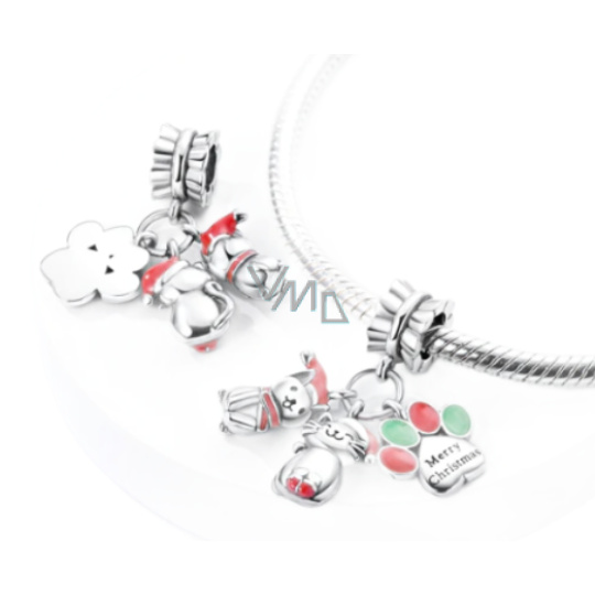 Přívěsek ze sterlingového stříbra 925 s roztomilým pejskem a kočičkou ve vánoční čepici a potiskem tlapky s vyrytým nápisem "Merry Christmas", navržený s hladkým červeným a zeleným smaltem. S každým kouzlem vyprávějte svůj příběh a vytvořte náramek, který odráží, kdo jste a co je pro vás důležité. Váš styl. Váš náramek. Tvůj příběh.