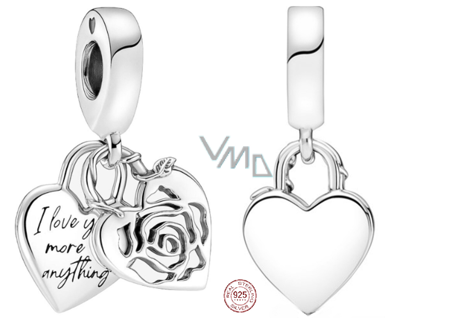 Charm Sterlingové stříbro 925 Visací zámek, srdce a růže, přívěsek na náramek láska