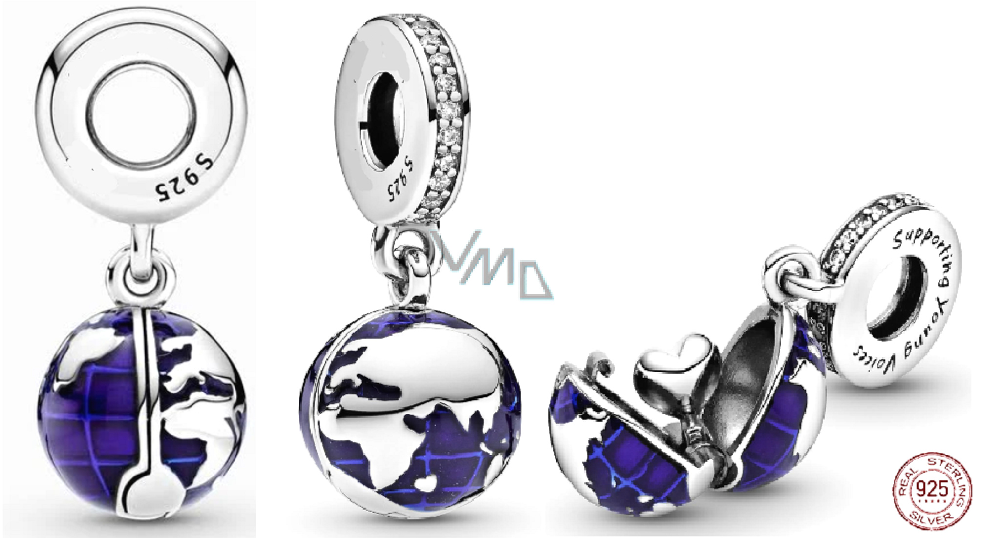 Planeta Země. Visací přívěsek 925 Sterling Silver se zeměkoulí je navržený s hladkým modrým smaltem. Na smaltovaném povrchu lze vidět zřetelné linie zeměpisné délky a šířky, pavé závěsný kroužek je gravírovaný "Supporting Young Voices - Podpora mladých hlasů" a zdobený třpytivými Zirkony. Uvnitř zeměkoule se ukrývá srdíčko. Perfektní doplněk vašich cestovatelských příběhů.