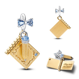 Jemný a originální stříbrný přívěsek ve tvaru zlaté knihy je vyroben z kvalitního stříbra 925/1000 a doplněn pozlacenými detaily, drobnou tužkou a elegantní mašlí s modrými kamínky. Precizní zpracování a kombinace stříbrné a zlaté barvy dodávají šperku luxusní, ale zároveň něžný vzhled.