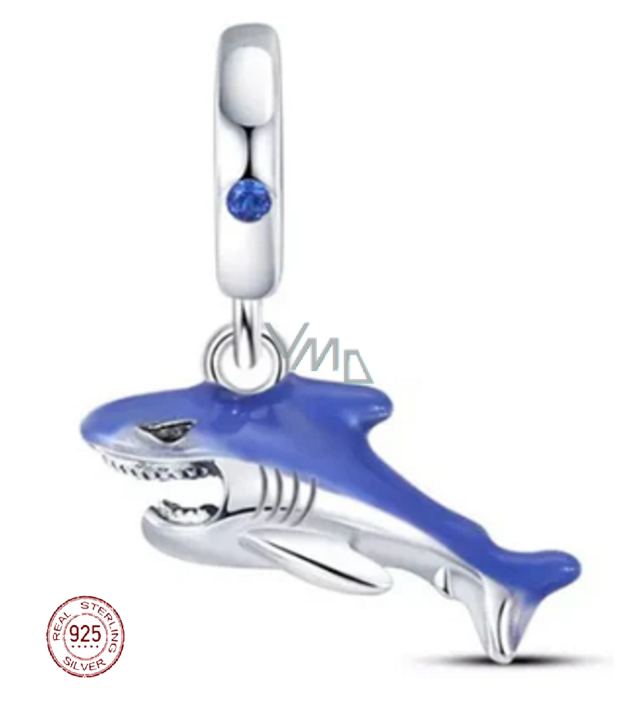 Přívěsek se žralokem je vyroben ze sterlingového stříbra 925 s hladkým modrým smaltem a odpovídajícím modrým třpytivým zirkonovým drahokamem na prstenu přívěsku. Žralok je amulet proti všem druhům nebezpečí. Tento vodní dravec, vládce moří, je inteligentní a obezřetný tvor se špatnou pověstí.