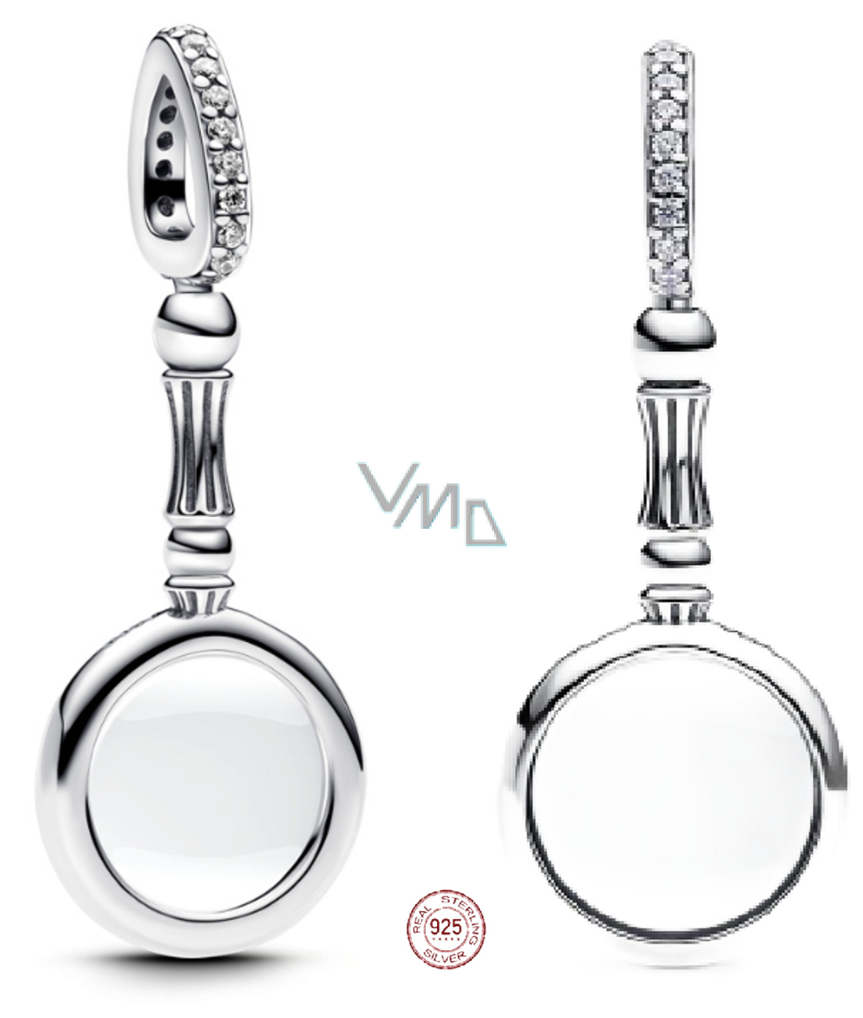 Objevte svět v nových detailech s visícím přívěskem s lupou. Tento inovativní kousek, vyrobený ze sterlingového stříbra, obsahuje skutečnou čočku, která zvětší váš pohled. Kouzlo je zdobeno vzkazem „LOVE IS IN THE DETAILS“ - "Láska je v detailech." vyrytým na okraji a řadou jiskřivých pavé na kauci, což z něj činí speciální dárek pro ty, kteří si uvědomují, že láska spočívá v maličkostech.