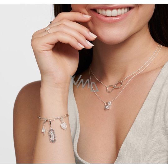 Najděte své štěstí: Zarámovaný prvek ve středu kouzla se otáčí kolem své vlastní osy. Na jedné straně jej zdobí univerzální symboly srdce, míru a nekonečna. Na druhé jsou zakomponována dvě srdce a blesk. Přívěsek s vyvýšenými strukturami a kameny Zirkony je ručně zpracován do velmi detailů a je ideální pro kombinaci s dalšími kouzly.