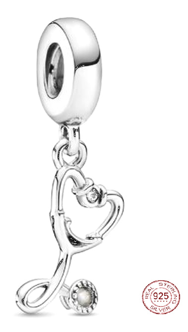 Vzdejte hold zdravotníkům, jako jsou lékaři a zdravotní sestry, a jejich práci nebo čerstvým maturantkám zdravotní školy, pomocí tohoto přívěsku se srdíčky stetoskopu. Přívěsek, ručně zpracovaný, obsahuje stetoskop tvořící srdce. Přívěsek, bohatý na detaily, je zdoben kamenem kubické zirkonie osazeným v obrubě nahoře a malými kuličkami podél okraje hlavy, který spočívá na hrudi. Ideální pro člověka s velkým srdcem.