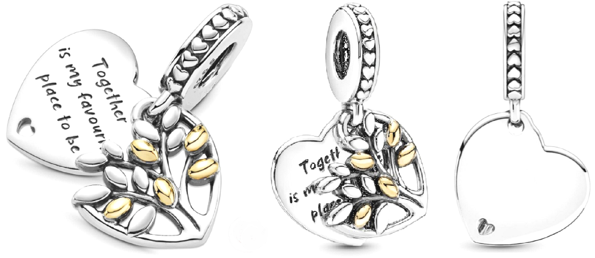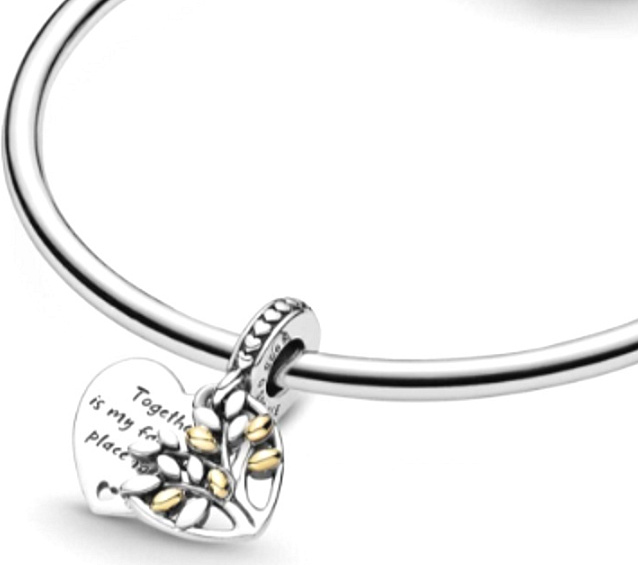 Vzdejte hold svým nejsmysluplnějším vztahům s tímto dvoubarevným přívěskem Family Tree ve tvaru srdce. Prolamovaný šperk, ručně zpracovaný, má motiv stromu na leštěném kotouči ve tvaru srdce zdobeném rytinou. Přívěsek také obsahuje lístky a řadu srdíček vyražených na háčku. Kouzlo doplněné rytinou „Společně je moje oblíbené místo“ a razítkem na háčku je perfektním dárkem pro zvláštní osobu na oslavu pouta, které vás spojuje.