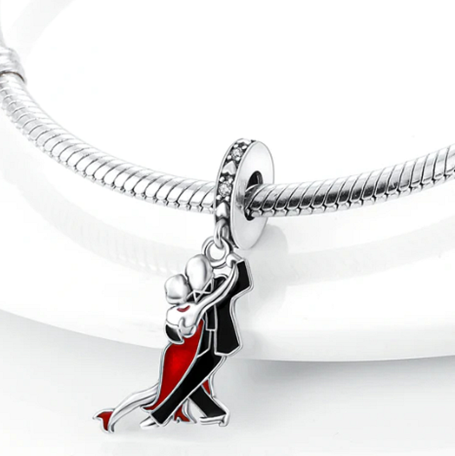 Visací přívěsek představující pár společenských tanců, navržený s hladkým červeným a černým smaltem. Prsten kouzla je zdoben malými srdíčky a třpytivými bílými drahokamy Zirkonu po celém obvodu.
