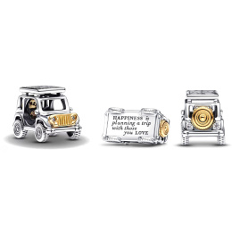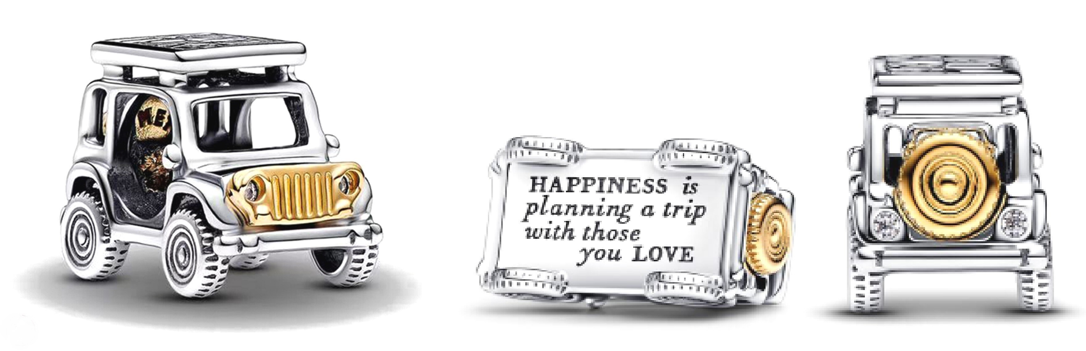 Doplňte svou touhu pomocí dvoubarevného přívěsku pro dobrodružství. Tento přívěsek zobrazuje vůz se všemi detaily, od bočních zrcátek po kola a realistické škrábance. Rezervní pneumatika a MŘÍŽKA jemně pozlacené 14karátovým zlatem dodávají kontrast, zatímco třpytivé kameny fungují jako přední a zadní světla. Vystřižená písmena na zvednuté střeše auta hlásají „ADVENTURE“ a rytina na spodní straně vozu hlásá „ŠTĚSTÍ plánuje výlet s těmi, které MILUJETE.“ Známka letního dobrodružství na cestách.