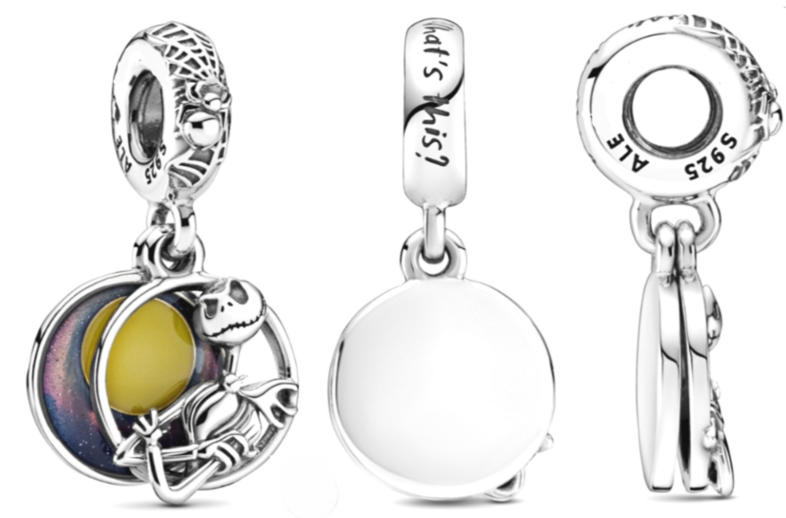 The Nightmare Before Christmas - ukradené Vánoce. Oslavte Halloween s Disney. Přívěsek ručně dokončený, zadní disk zobrazuje měsíc v úplňku proti noční obloze, natřený ručně aplikovaným tmavě žlutým a Levandulovým čirým smaltem. Přední disk s prolamovaným zpracováním zobrazuje 3D verzi hlavního hrdiny Disneyho příběhu: Jacka Skellingtona. Háček obsahuje dekorace připomínající pavučiny, stejně jako logo Disney a rytinu „Co je to?“ Spárujte s dalšími kouzly inspirovanými dovolenou pro zábavný a zároveň strašidelný vzhled.