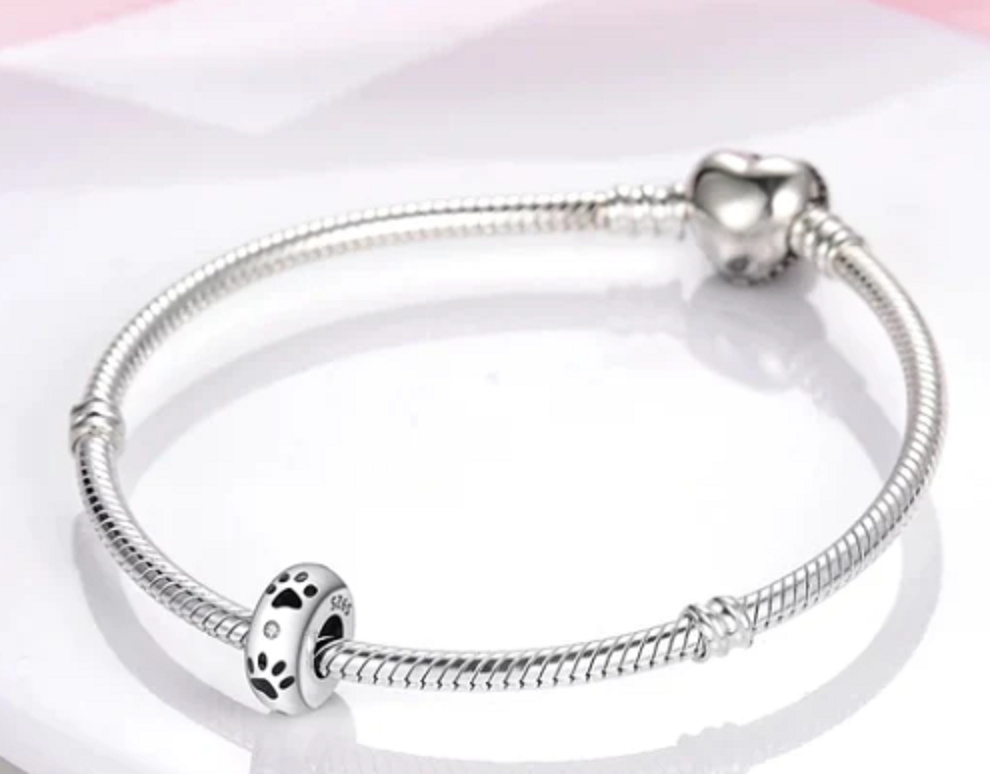 Přívěsek s malými černými smaltovanými otisky tlapek a zdobený bílým třpytivým Zirkonem. Přívěsek je vyroben s důrazem na detail a některé prvky jsou ručně malované.