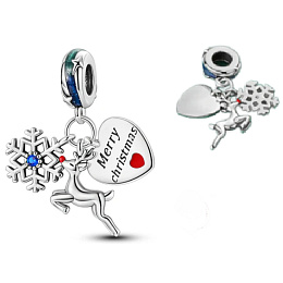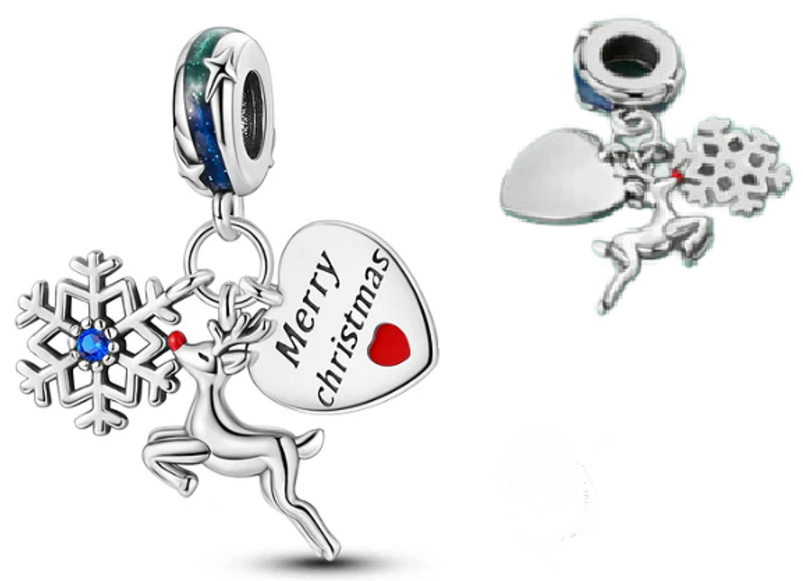 Přívěsek se sněhovou vločkou se zářivě modrým zirkonovým drahokamem, sobem a srdcem s vyrytým nápisem "Merry Christmas", navržený s hladkým červeným, zeleným a modrým smaltem. S každým kouzlem vyprávějte svůj příběh a vytvořte náramek, který odráží, kdo jste a co je pro vás důležité. Váš styl. Váš náramek. Tvůj příběh.