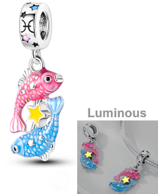 Svítí ve tmě. Přívěsek záře v temném kouzlu zvěrokruhu se symbolem Ryby, navržená s hladkým žlutým, růžovým a modrým smaltem a třpytivými růžovými drahokamy Zirkonu. Na prstenu kouzla jsou kolem dokola malé Hvězdy a na něm vyrytý astrologický symbol pro Ryby.