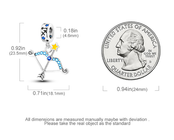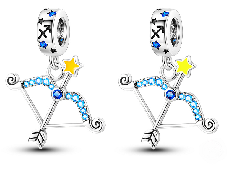 Září ve tmě, přívěsek zvěrokruhu se symbolem luku a šípu Střelce, navržená s hladkým žlutým smaltem a odstíny zářivě modrých zirkonových drahokamů. Na prstenu kouzla jsou kolem dokola malé Hvězdy a na něm vyrytý astrologický symbol pro Střelce.