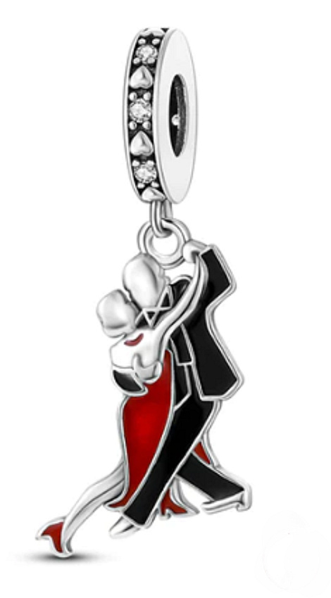 Visací přívěsek představující pár společenských tanců, navržený s hladkým červeným a černým smaltem. Prsten kouzla je zdoben malými srdíčky a třpytivými bílými drahokamy Zirkonu po celém obvodu.