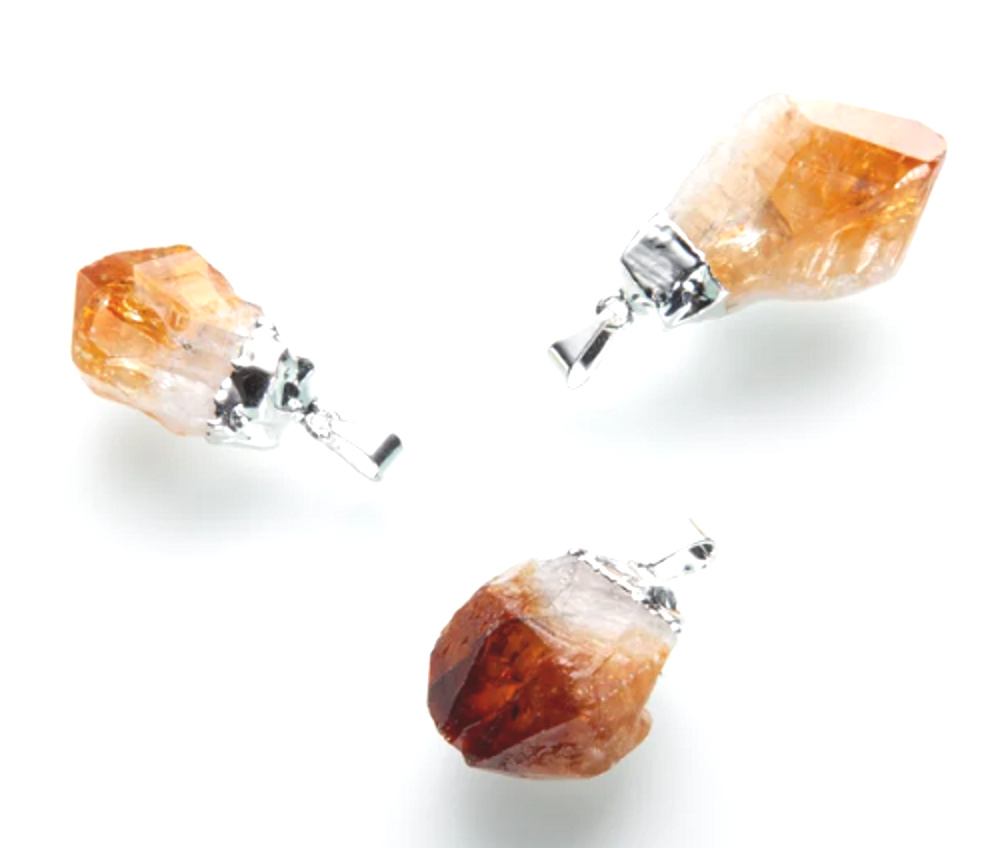 - Surový kousek citrinu ve tvaru špice je zasazen do kovu.