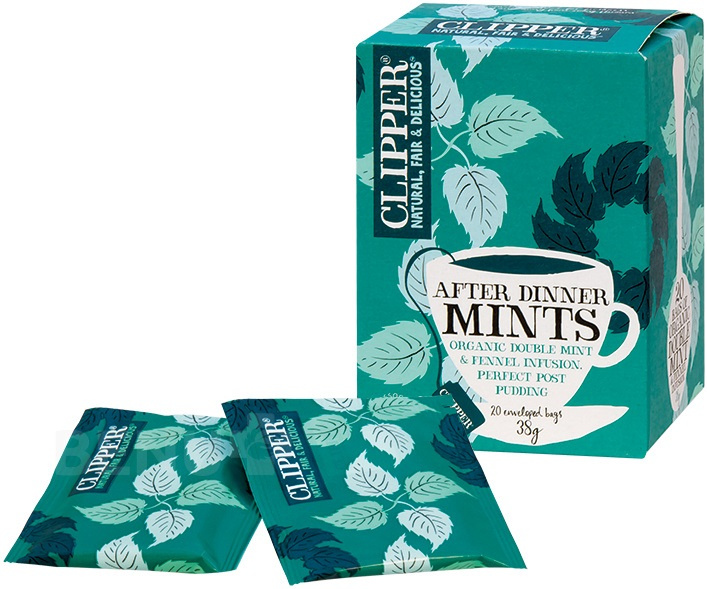 Čaj Clipper After Dinner Mints s Mátou, Fenyklem, Mentolem a Zázvorem je bylinný čaj, který přináší osvěžení po večeři a zlepšuje trávení.