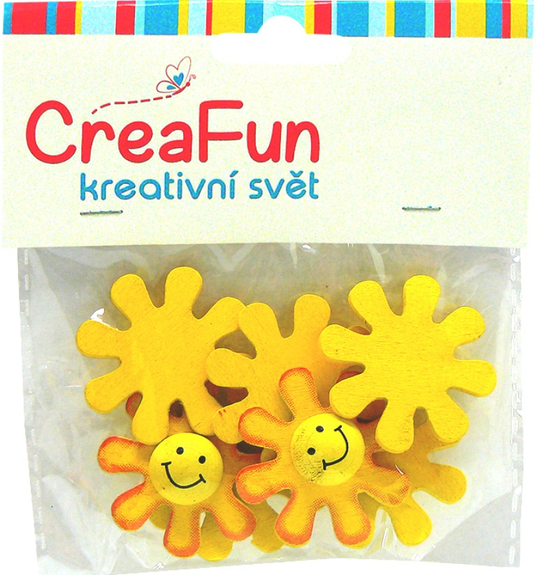 Mix barevných, dřevěných dekorací s motivem sluníčka s veselým potiskem.