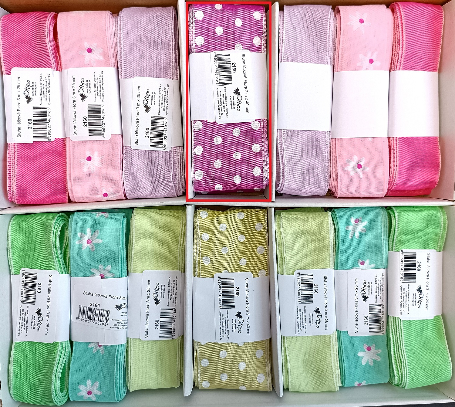 Krásná látková stuha s bílými puntíky je vhodná k aranžmá. Lze je použít při vazbě řezaných i sušených květin, ozdobit dárkové předměty nebo balíčky, nebo se také budou o Velikonocích hodit k uvázání na pomlázku. Zabalte dárky jednoduše do balícího papíru a omotejte těmito krásnými veselými stuhami.
