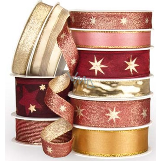 Krásná látková stuha v tmavě červené barvě se zlatými nitkami je vhodná k vánočnímu aranžmá. Lze je použít při vazbě řezaných i sušených květin, ozdobit dárkové předměty nebo balíčky. Zabalte dárky jednoduše do balícího papíru a omotejte těmito krásnými veselými stuhami.