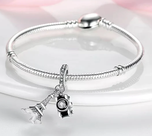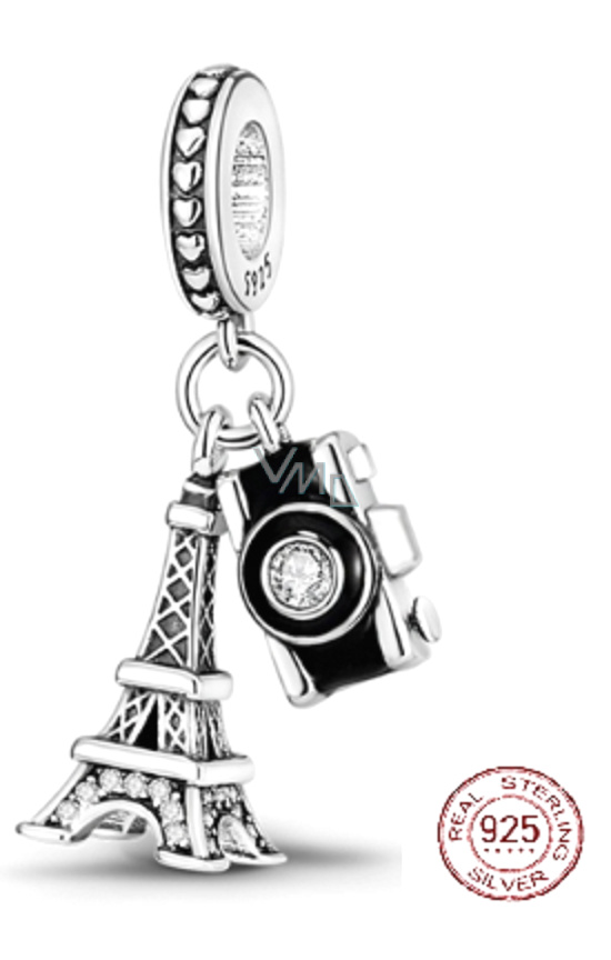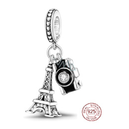 Charm Sterlingové stříbro 925 Paříž Eiffelova věž + fotoaparát, pozdrav z Francie, 2v1 přívěsek na náramek cestování