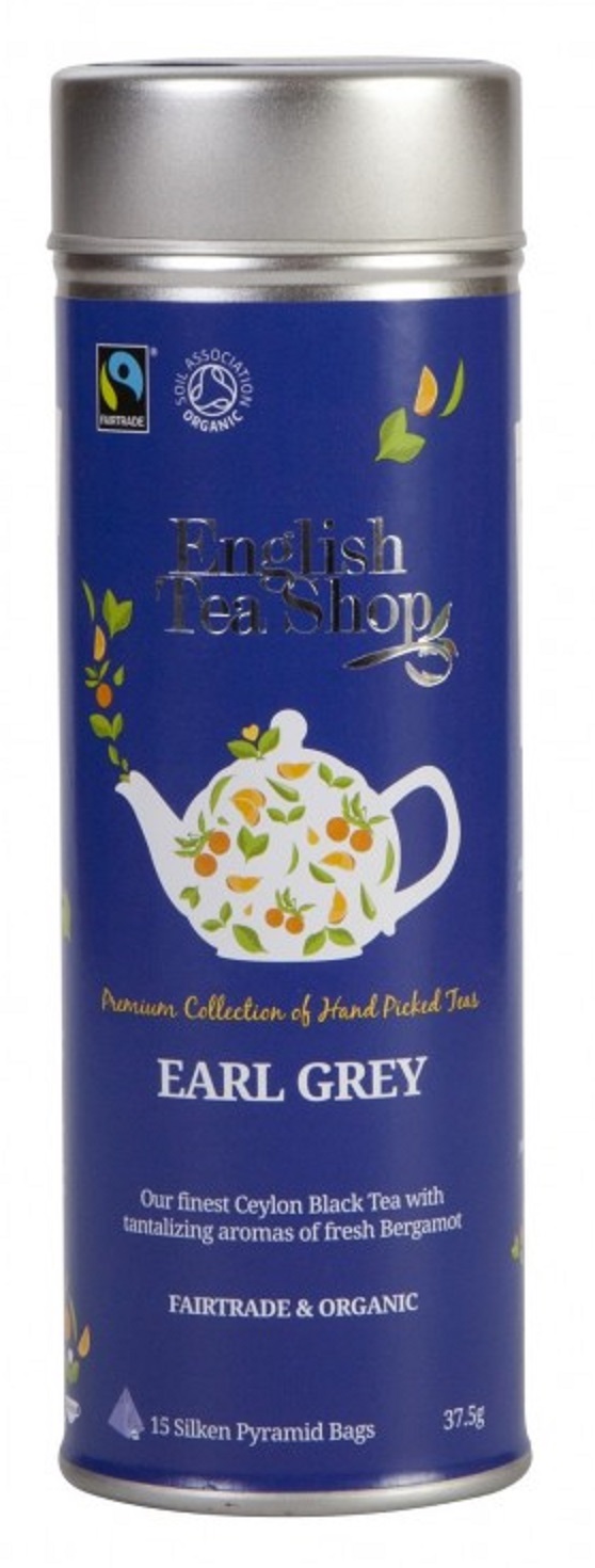 English Tea Shop Bio Černý čaj Earl Grey 15 kusů bioodbouratelných pyramidek čaje v recyklovatelné plechové dóze 30 g