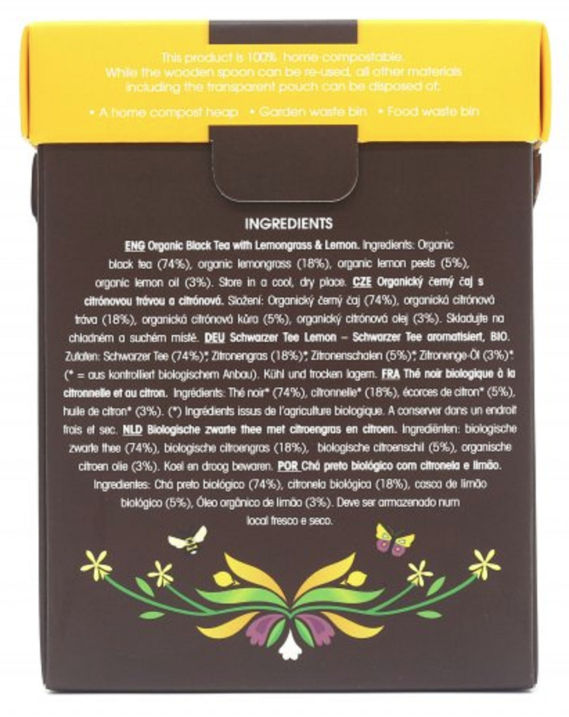černý čaj (74%)*, Citronová tráva *(17%)*, Citronová kůra (4%)*, přírodní Příchuť Citronu (4%), přírodní Kyselina Citronová (1%)